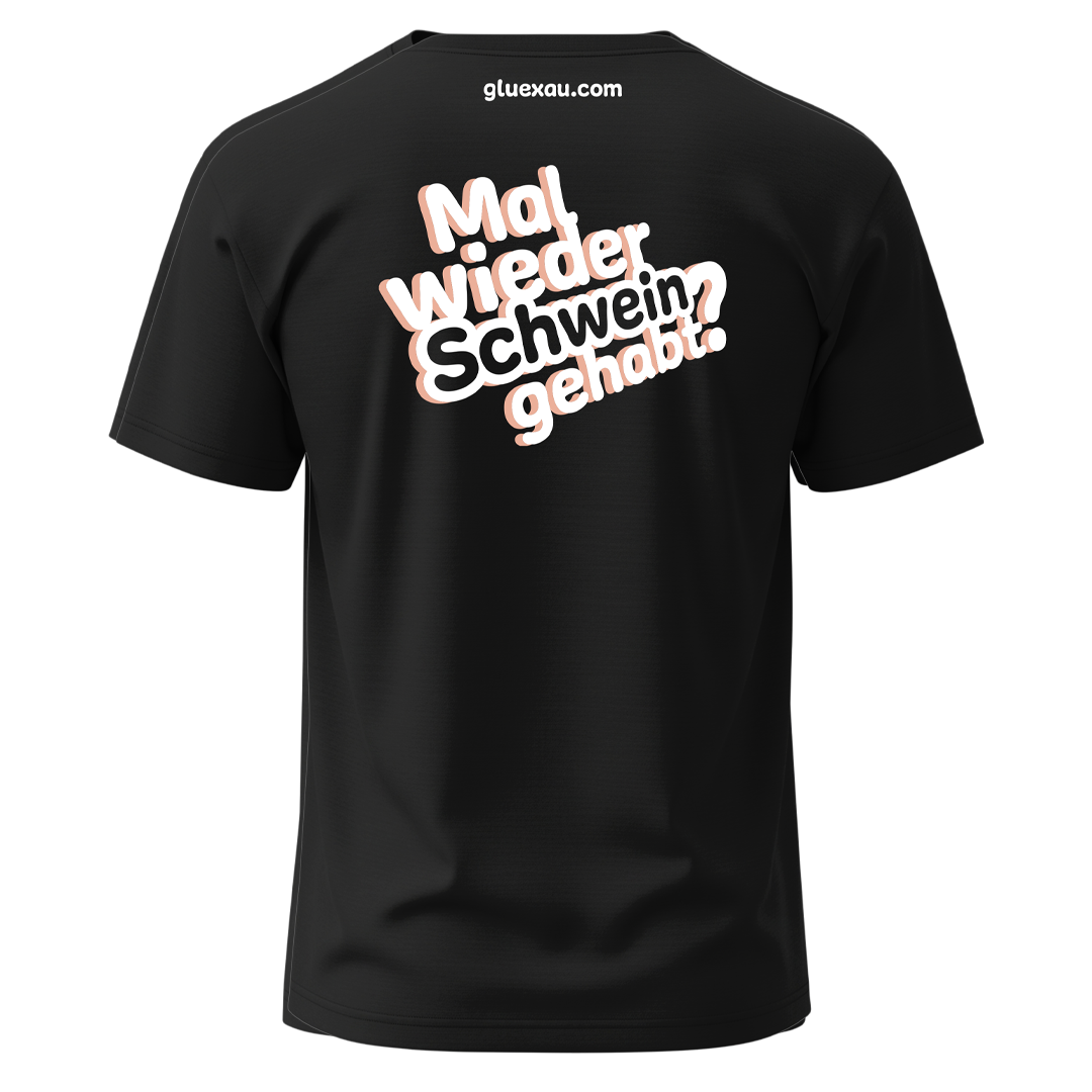 Auf dem Rücken sorgt der Spruch „Wieder mal Schwein gehabt?“ für ein Augenzwinkern und Gesprächsstoff.